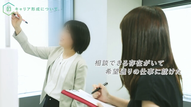 採用動画パッケージ「ミテシル」を使用した社員インタビュー映像です。企業ロゴのトンマナと、製薬や研究開発に関わる事業内容に合わせて、「理系」イメージの装飾を使用しました。入社のきっかけ~今後の目標まで幅広くインタビューすることで動画を見る方に働くイメージを醸成します。
